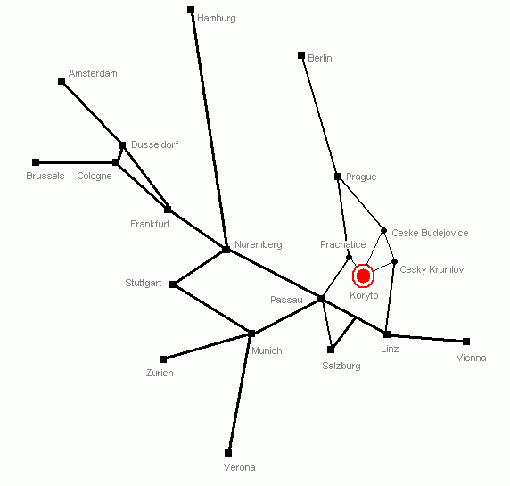 The village of Koryto belongs to the nearby city of Prachatice (16 km. or about 10 miles distant from Koryto) in the Province of Ceské Budêjovice (Budweis) of Southern Bohemia, Czech Republic. Four supermarkets and many stores in Prachatice - most of them open on Sundays - offer a range of shopping opportunities. The cities of Ceské Budêjovice (Budweis) and Ceské Krumlov (Krumau)– each approximately 35 km. (about 20 miles) East of Koryto - can be conveniently reached by car. Both cities are centers of architectural and art-historical treasures. A major highway runs from the German (Bavarian) / Czech border station of Phillipsreut to the vicinity of Koryto, which is then reached via a smaller hardtop road, a total distance of about 35 km. (20 miles) from the border. Prague, the Czech capital, lies North of Koryto at a distance of about 150 km. (about 92 miles). There are excellent roads leading to Prague, bus transportation is available, as well as travel by train from Ceské Budêjovice (Budweis) to Prague. Many Prague residents spend their weekends in Southern Bohemia, including the area around Koryto. With only about forty permanent residents Koryto is hardly a turbulent